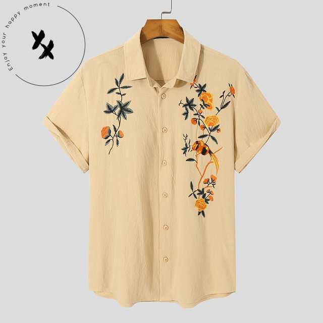 Short Sleeve Cotton/linen Blend Art Embroider Summer Shirts For Man's Summer Casual